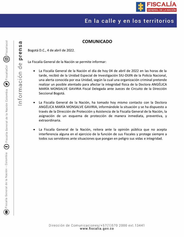 La Fiscalía General de Colombia, denunció que un grupo criminal de ese país amenazó de muerte a la fiscal delegada ante el circuito de Jueces de Bogotá, Angélica María Monsalve Gaviria, por lo que le fue asignado un esquema de seguridad inmediato.