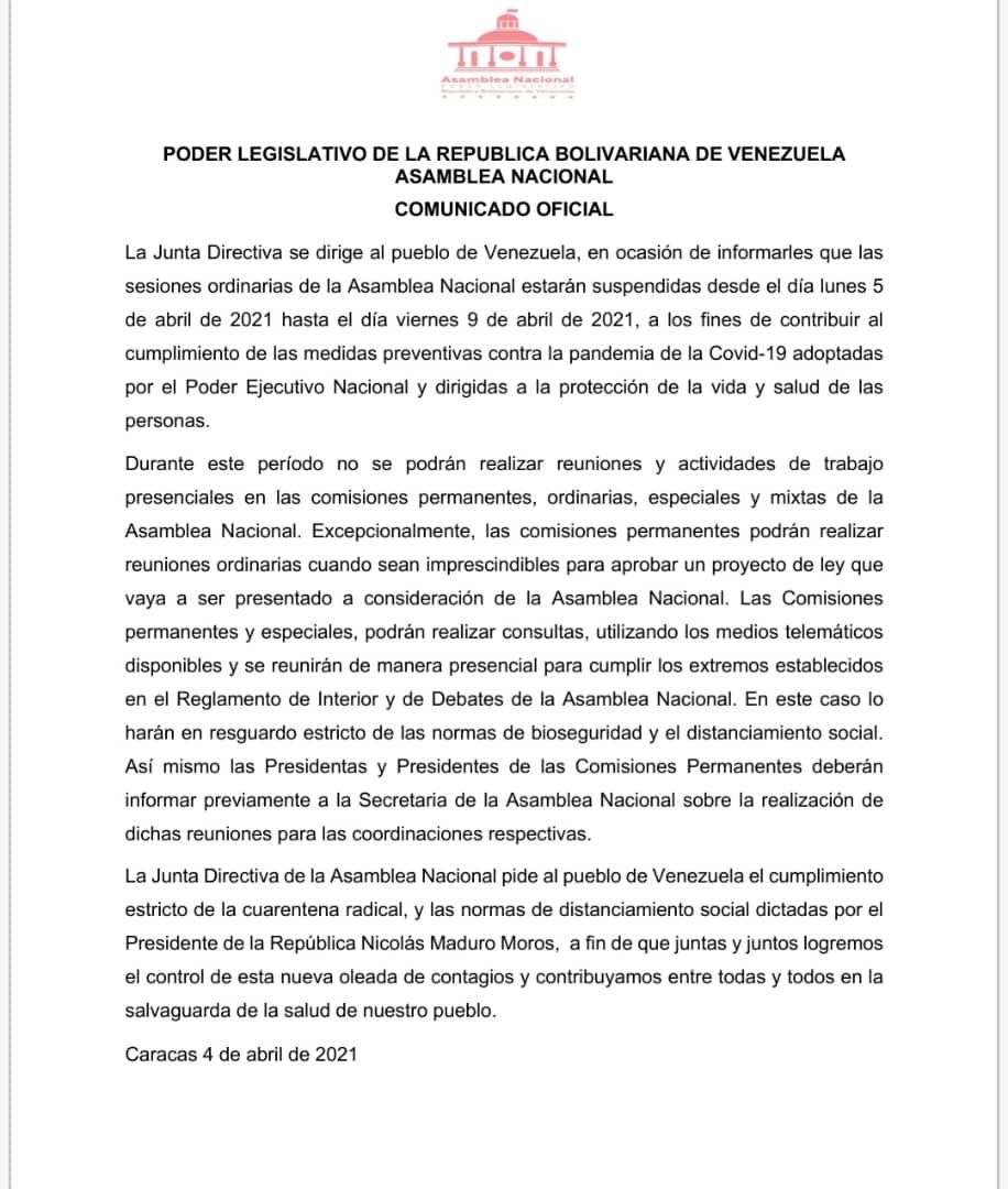 La junta directiva de la Asamblea Nacional (AN) anunció al país la suspensión de las actividades desde el día 5 de abril hasta el 9 de abril,  a fin de cumplir con las  medidas de prevención ante la pandemia del Covid-19.