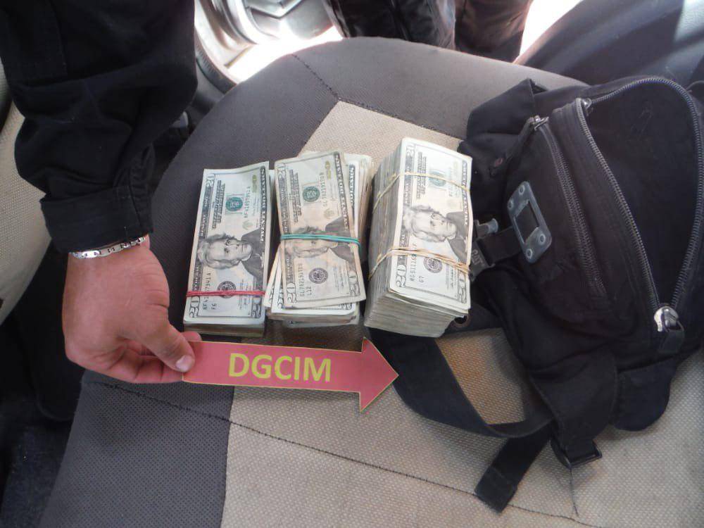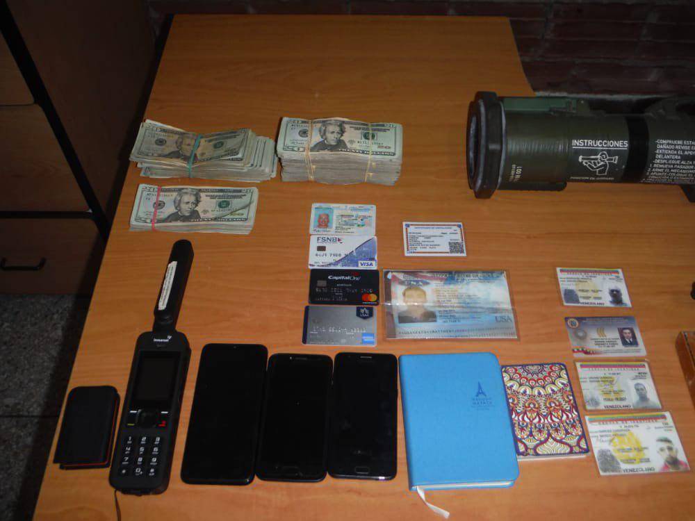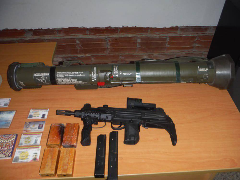 De acuerdo a las imágenes presentadas por el jefe del Ministerio Público (MP) tenía en su posesión un lanzagranadas AT4 calibre 84 mm; una sub ametralladora modelo UZI calibre 9 mm; cuatro piezas rectangulares de presunto material explosivo (C4) y dinero en moneda extranjera, el cual transportaba en un vehículo marca Chery, modelo Arauca.
