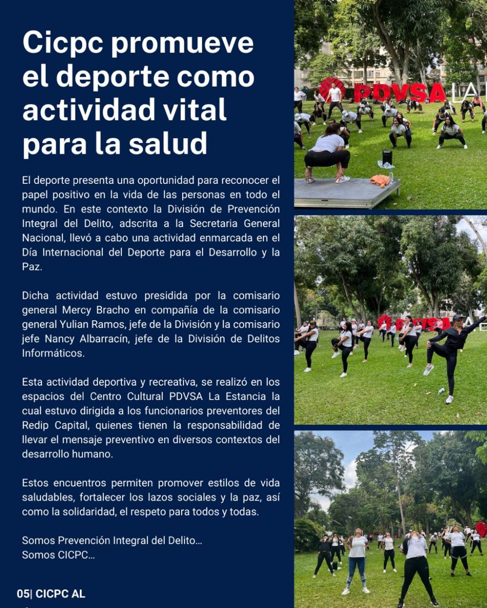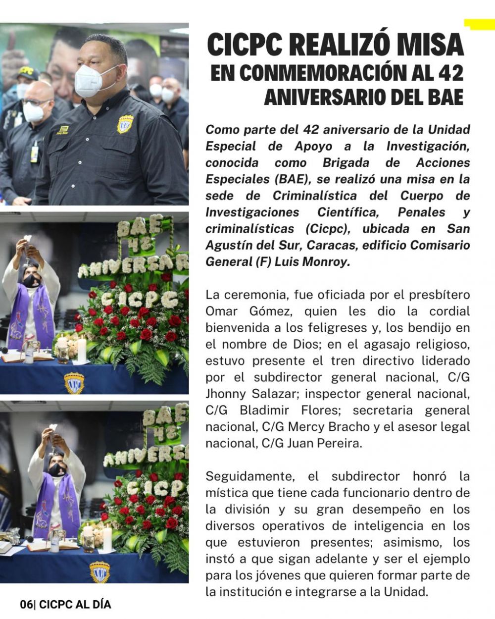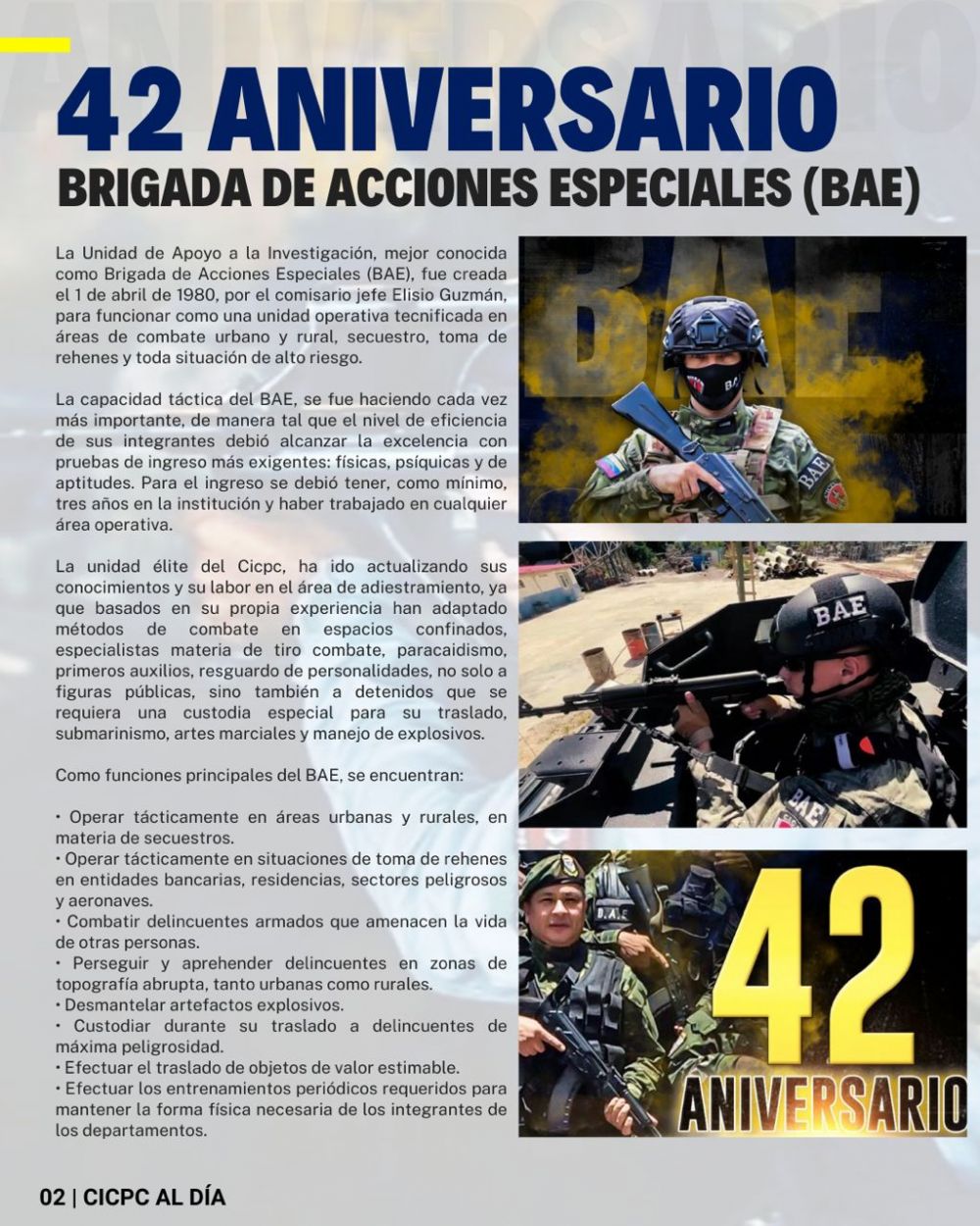 "La idea es dar difusión a parte del trabajo que realiza nuestra institución. La semana que culmina hoy, estuvo enmarcada por la celebración del 42 aniversario de la creación del grupo BAE, esta unidad élite viene creciendo con pasos agigantados en formación y operatividad técnica", expresó el director de este cuerpo policial, Comisario Douglas Rico.