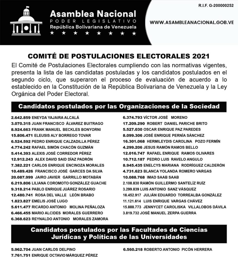 Este 10 de abril el Comité de Postulaciones Electorales de la Asamblea Nacional (AN) presentó el listado de los aspirantes a rectores y rectoras del Consejo Nacional Electoral (CNE) que superaron el segundo ciclo de evaluación de acuerdo a la Constitución Bolivariana de Venezuela y la Ley Orgánica de Procesos Electorales.
