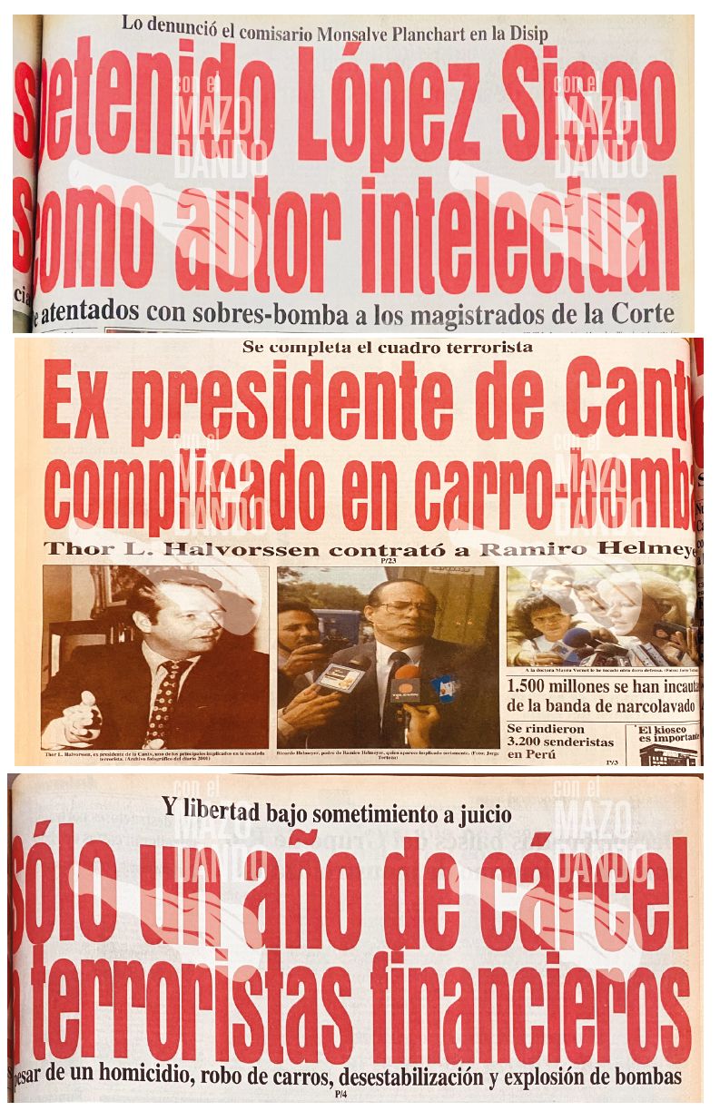 - Producto de esta asociación para delinquir, explotaron en Caracas nueve bombas en un lapso de cinco meses, con el degenerado propósito de ocasionar terror judicial y un supuesto colapso bursátil en los valores de los bonos de la deuda pública y acciones de alto rendimiento económico.