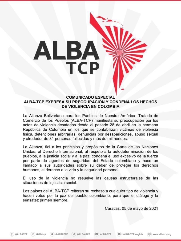 La Alianza Bolivariana para los Pueblos de Nuestra América - Tratado de Comercio de los Pueblos (Alba-TCP) condena la violación de los Derechos Humanos de los colombianos por parte del gobierno de Iván Duque.