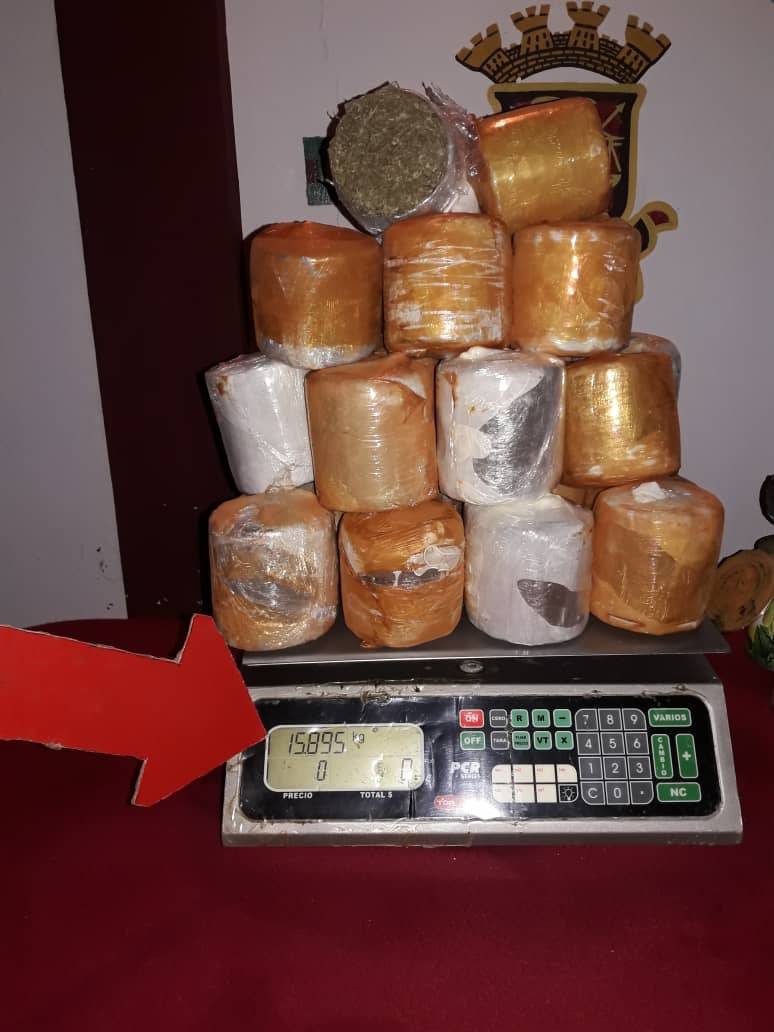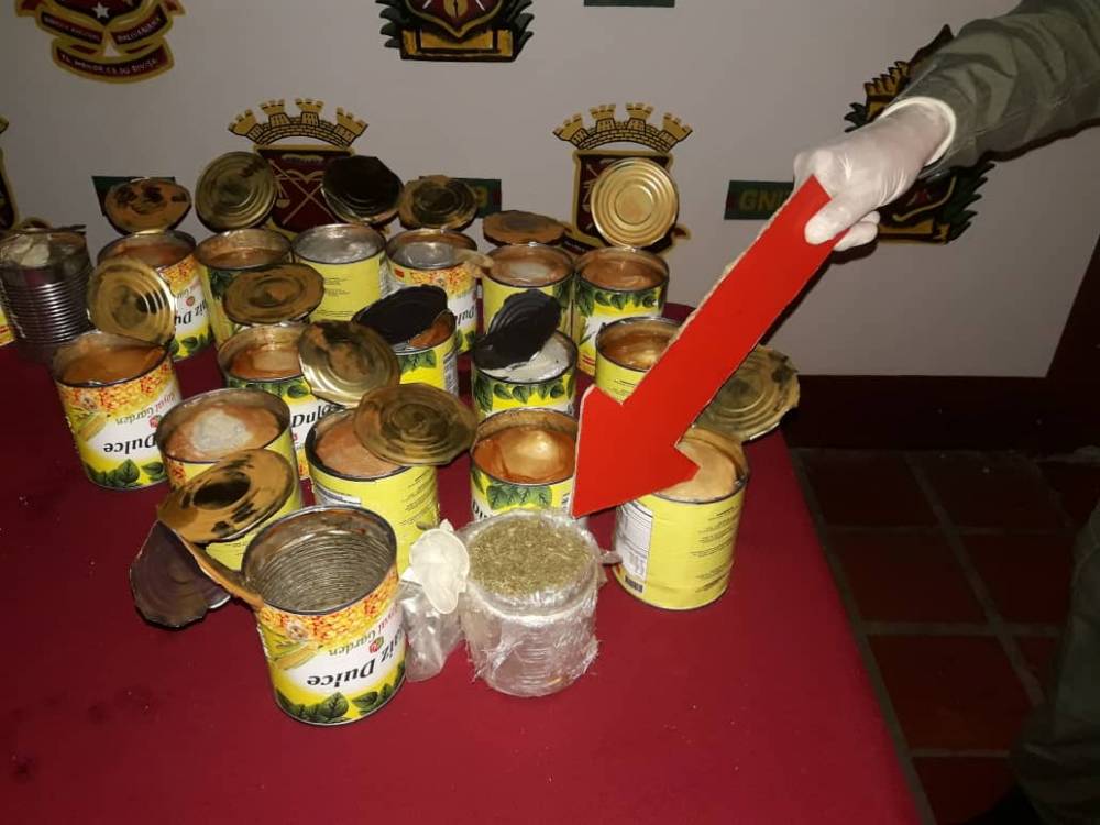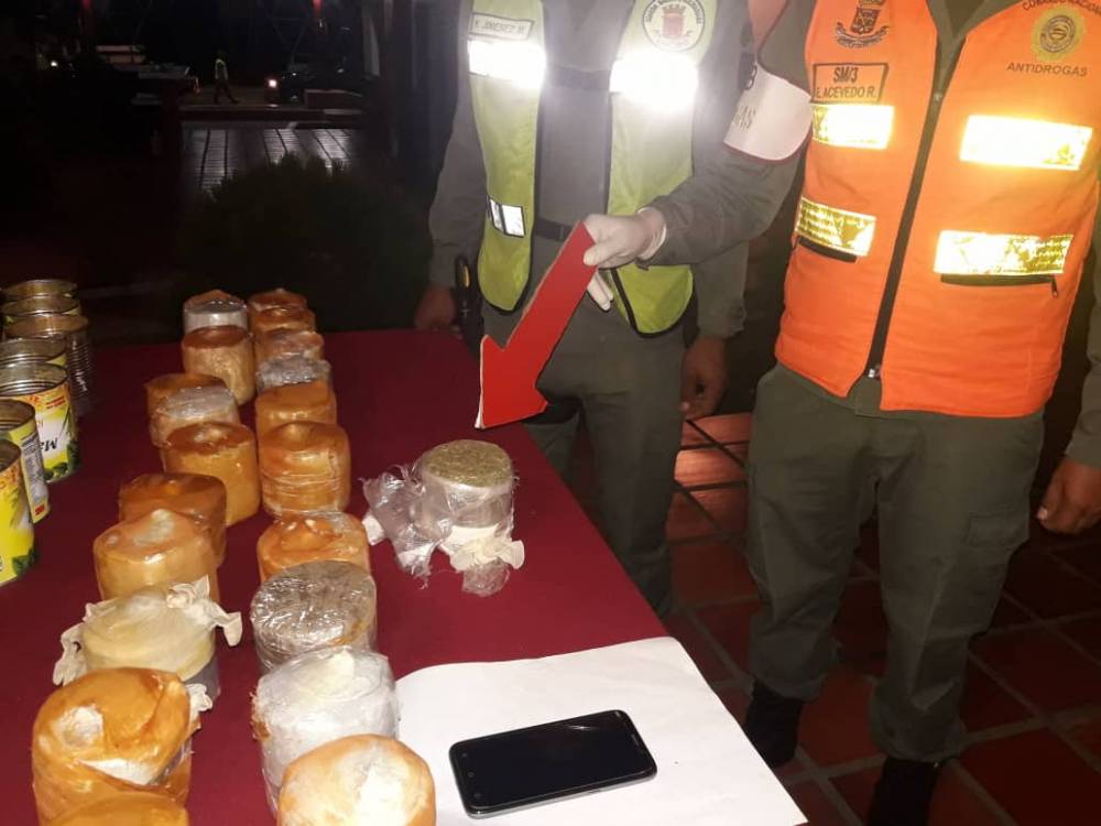 La droga se encontraba oculta dentro de latas de maíz, con un peso de 15,895 kilogramos, y la trasladaban en un vehículo de transporte público de la empresa Nueva Generación, proveniente de San Antonio, estado Táchira con destino a la ciudad de Valencia.