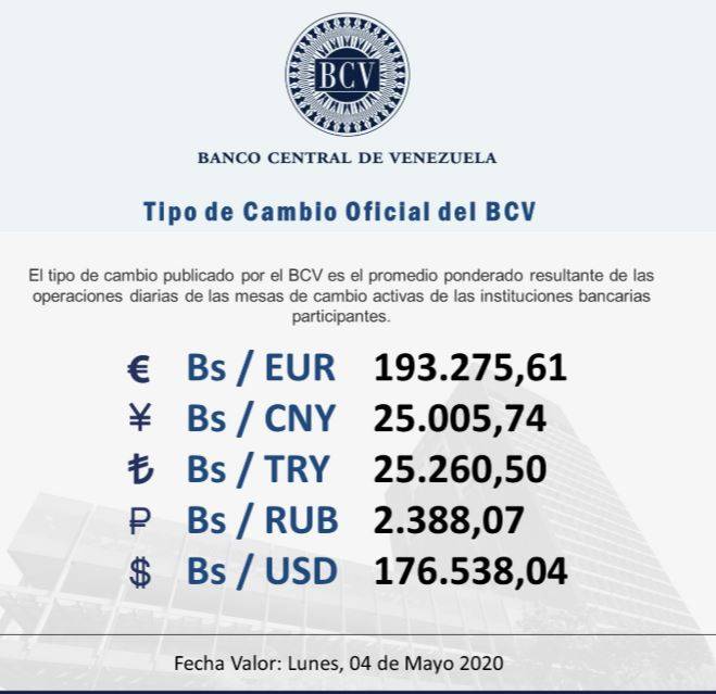Por su parte, el resto de las divisas se ubicaron en: el yuan en Bs. 25.005,74; la lira turca en Bs. 25.260,50; el rublo en Bs. 2.388,07 y el dólar en Bs. 176.538,04.