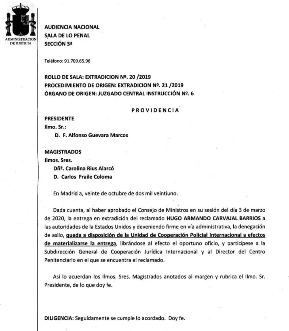 Los magistrados de la Sección 3ª de la Sala de lo Penal de la Audiencia Nacional informan en un documento que Carvajal “queda a disposición de la Unidad de Cooperación Policial Internacional a efectos de materializarse la entrega”.