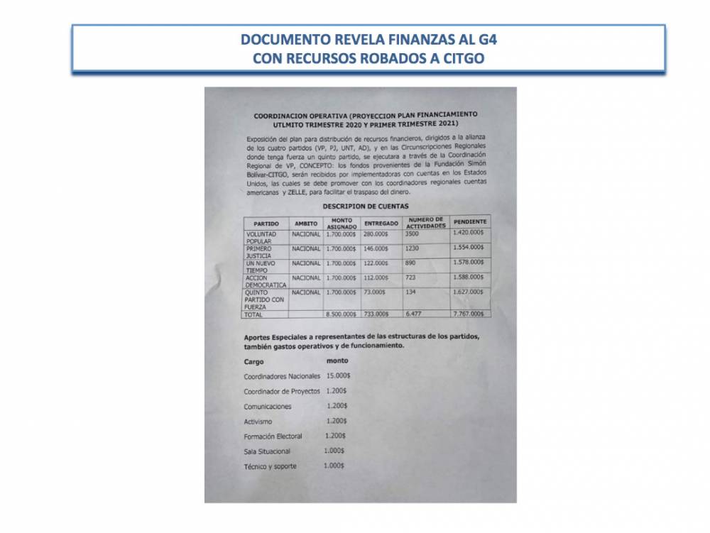 "En el teléfono del Sr. Roland Carreño, se detectó que el dinero robado iba a ser dirigido a los partidos políticos de la oposición (...) 8.5 millones de dólares fueron robados a CITGO por medio de la Fundación Simón Bolívar, para ser entregados a los dirigentes d los partidos políticos de oposición", puntualizó Rodríguez.