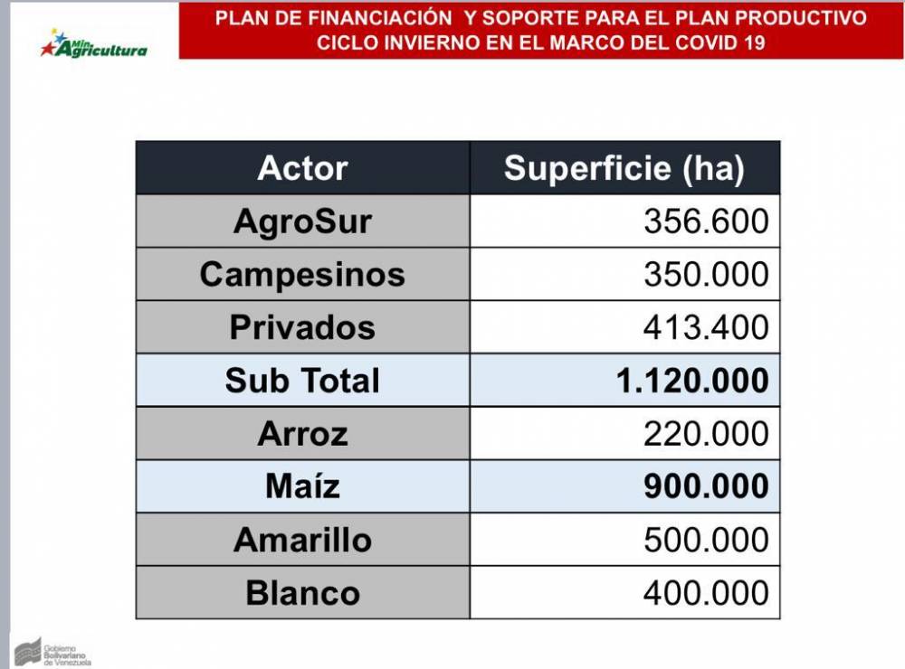 También se aprobó más de 58.000 petros al conglomerado AgroImproa C.A.; para la siembra de cereales, con el fin de fortalecer el aparato productivo en medio de la pandemia coronavirus (Covid-19).