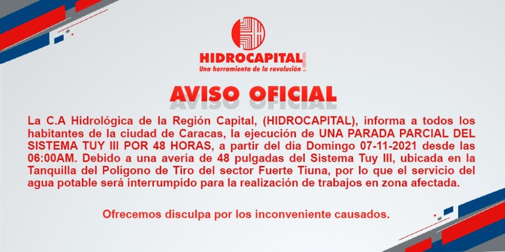 De acuerdo con la información emitida por la institución la suspensión responde a la realización de una Parada Parcial del Sistema Tuyo III, debido a la reparación de una avería de 48 pulgadas.