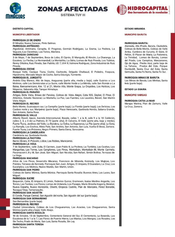 "#Hidrocapital informa que debido a una avería en el Sistema Tuy III, los siguientes sectores se verán afectados en el suministro de agua potable por un lapso estimado de 24 horas. Ofrecemos disculpas por las molestias ocasionadas", escribió la compañía de suministro de agua en la red social Twitter.