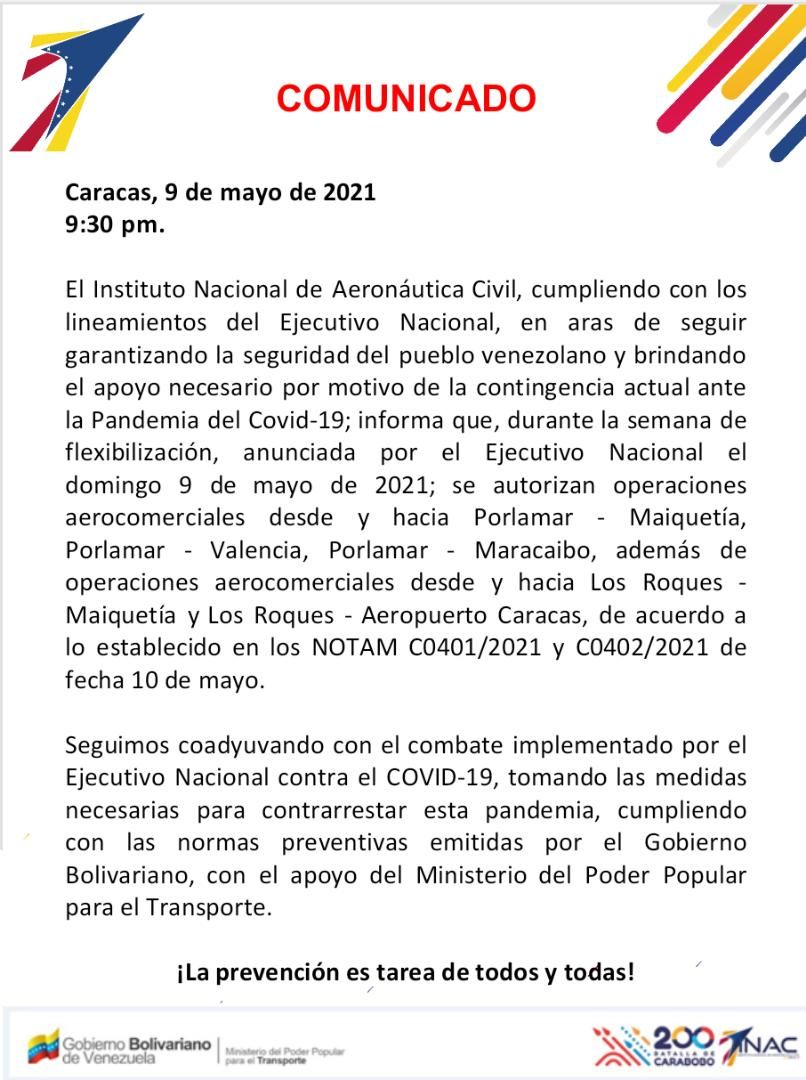 El Instituto Nacional de Aeronáutica Civil, cumpliendo con los lineamientos del Ejecutivo Nacional, en cuanto a la flexibilización de las actividades comerciales informa las medidas para el sector aéreo nacional de acuerdo a lo establecidos por la institución para la semana del 10 al 17 de mayo.