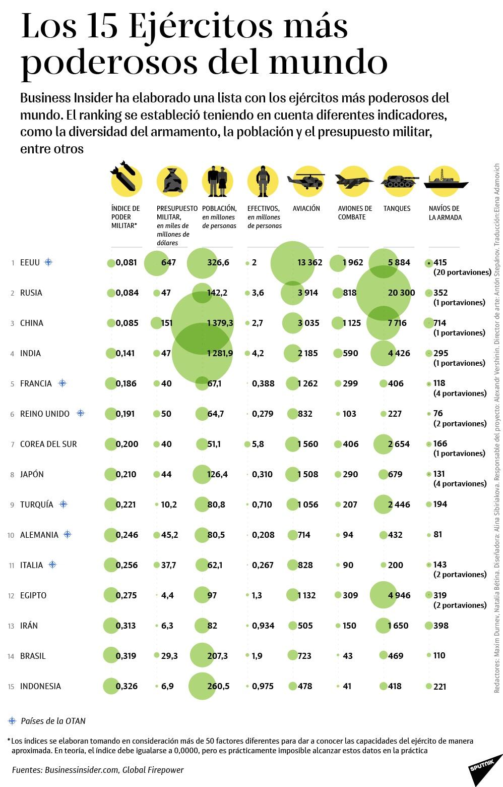 Estados Unidos,  Rusia y China lideran el ranking de los 15 países con los ejércitos más poderosos del mundo, según una infografía publicada este lunes por el medio ruso Sputnik, basada en una lista elaborada por Businnes Insider.
