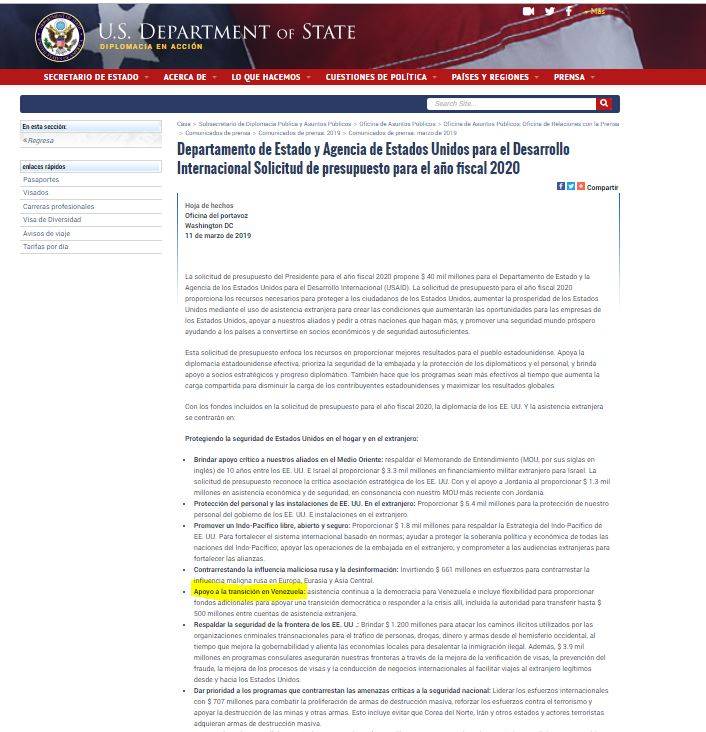 "Asistencia continua a la democracia para Venezuela e incluye flexibilidad para proporcionar fondos adicionales para apoyar una transición democrática o responder a la crisis allí, incluida la autoridad para transferir hasta $ 500 millones entre cuentas de asistencia extranjera", así señala la nota del Departamento de Estado de Estados Unidos sobre el punto único que trata el apoyo a la "transición en Venezuela".