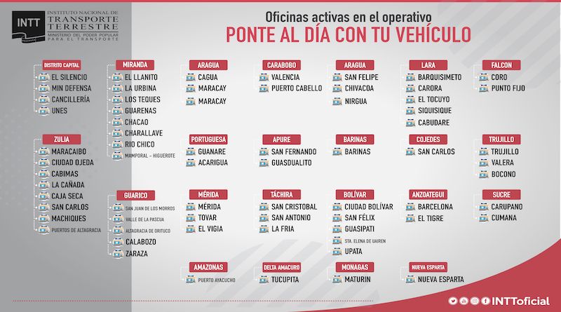 Este operativo funcionará desde este lunes 8 de febrero, desde las 8:30 de la mañana a 2:00 de la tarde, durante las semanas de flexibilización, en las oficinas regionales del Intt a excepción de las sedes de Ipsfa, Puerto Cumarebo, Churuguara y Mene Grande.