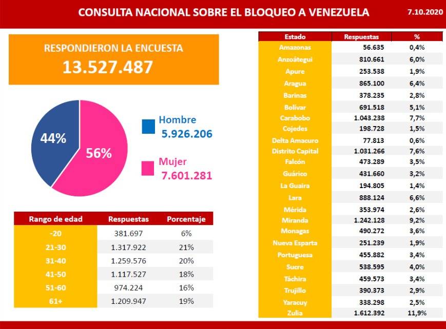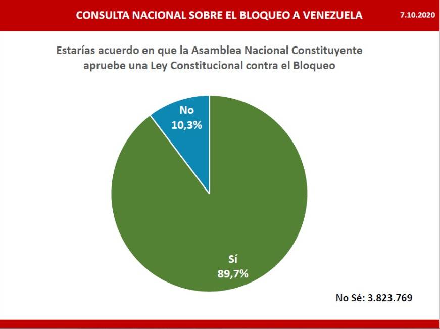 Detalló que mas del 89,7%  apoya  que la Asamblea Nacional Constituyente apruebe el proyecto de una Ley Antibloqueo, mientras que el 10,3% la rechaza .