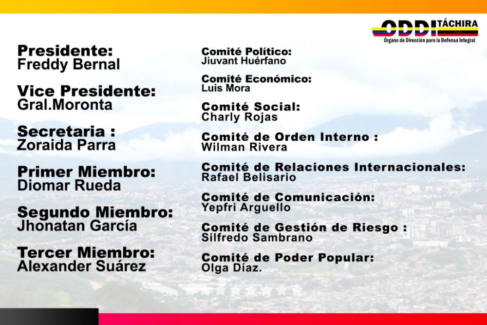 Resaltó Bernal que la estructura de la Oddi en la entidad quedó organizada de la siguiente manera. Presidencia: Freddy Bernal. Vicepresidente: G/D Ángel Moronta. Secretaria: Dra. Zoraida Parra. Primer miembro: Diomar Rueda. Segundo miembro: Jonathan García. Tercer miembro: Alexander Suárez.