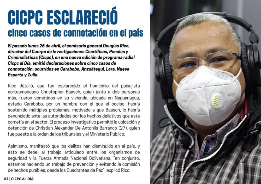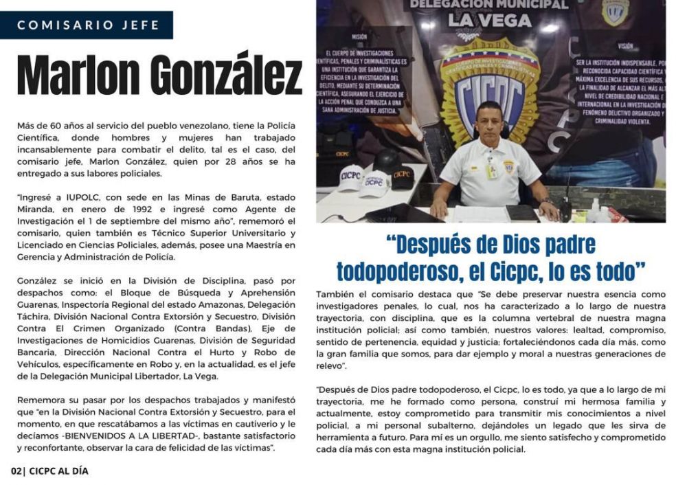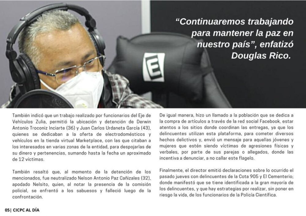 En esta edición el Cicpc destaca la labor del comisario jefe Marlon Gónzalez, quien se ha entregado por 28 años a sus labores policiales. Además, detalla sobre los cinco casos de connotación esclarecidos por este órgano de seguridad, de acuerdo a las declaraciones realizadas por el director de este cuerpo Douglas Rico en su programa radial Cicpc Al Día.