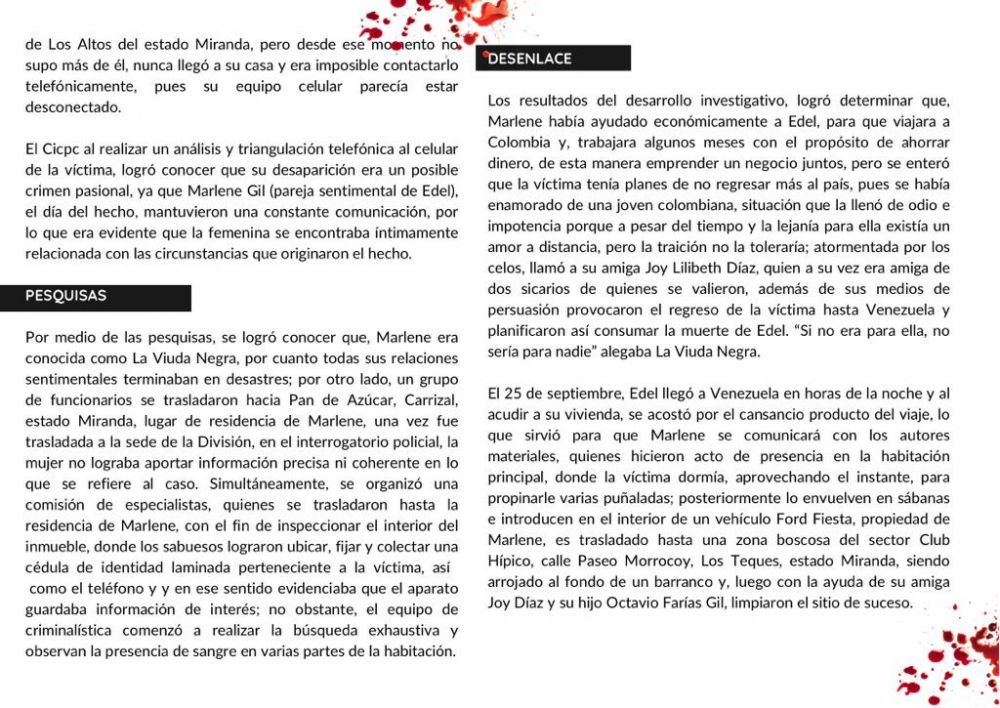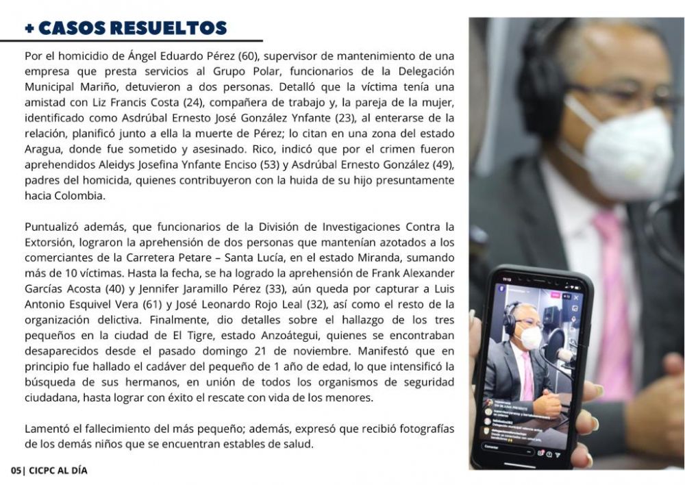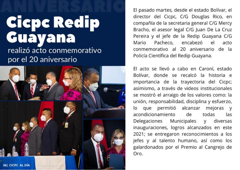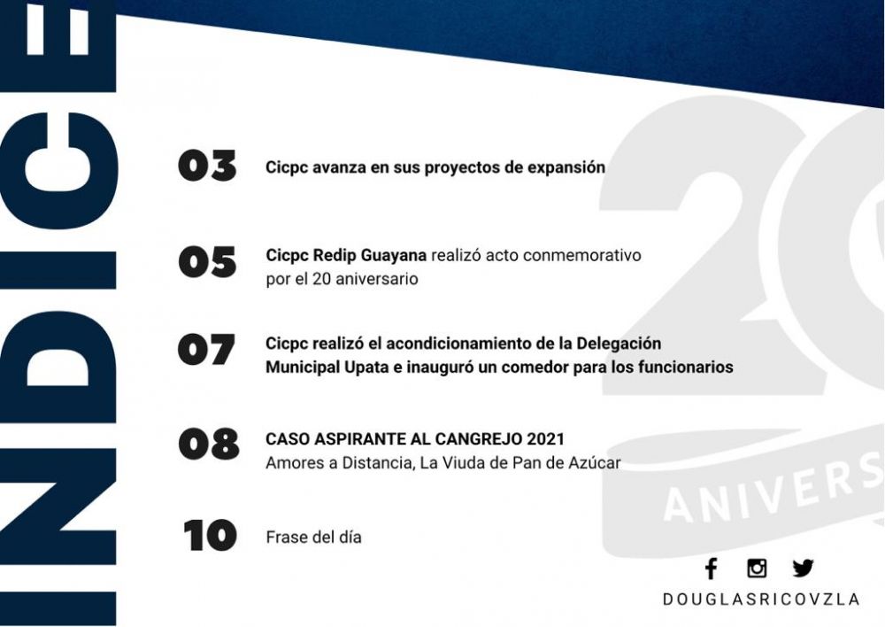 Esta edición contiene información de los avances realizados por la institución en sus proyectos de expansión, los actos conmemorativos del 20 aniversario de la este cuerpo policial realizados por la Región Estratégica de Investigación Penal (REDIP) Guayana y la presentación del caso aspirante al Cangrejo 2021; Amores a distancia ,la viuda de pan de azúcar.