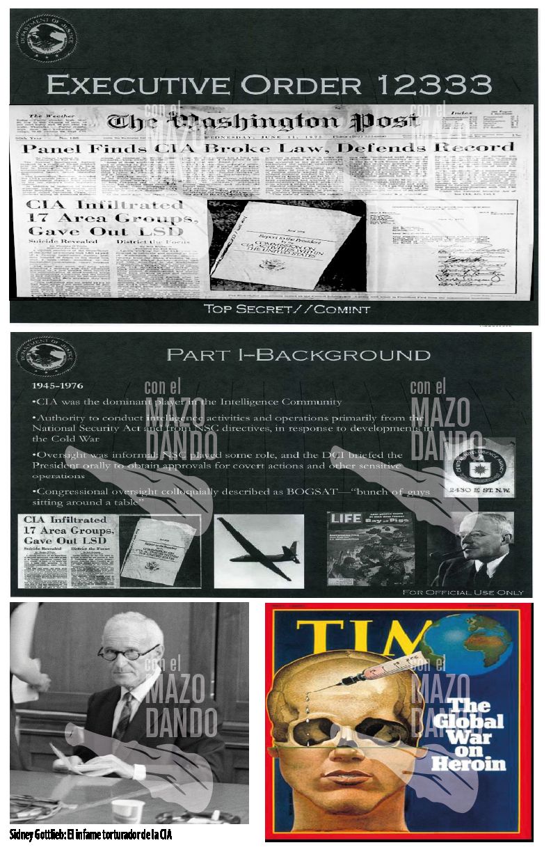 - Sidney Gottlieb, conocido como “El Torturador de la CIA”, llevó, entre 1946 y 1972, ensayos de guerra química similares con miles de otras personas escogidas como ratas de laboratorio para someterlas a los más inenarrables experimentos en seres humanos.