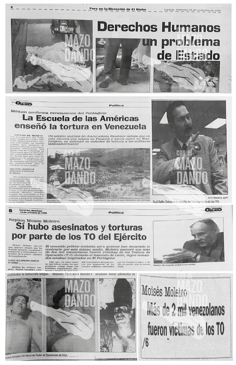 - A raíz de tales publicaciones, El Globo realizó un foro sobre los métodos de exterminio aplicados por el Pentágono en Venezuela, al cual fue invitado el Gral. Oswaldo Sujú Raffo, ex Inspector de las Fuerzas Armadas. Al ser interrogado sobre este particular, y para salir del paso, declaró: “De saber que ese era el tema, no hubiera venido... En este caso tendría que ser la embajada norteamericana quien muestre cuáles fueron los cursos de tortura y exterminio, y las listas de quienes los hicieron”.