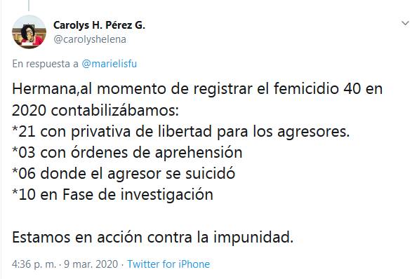 La vice ministra deProtección Social de Los Derechos Humanos para la Mujer en Venezuela Carolys Pérez en su cuenta @carolyshelena presentó cifras preliminares que dan cuenta de la lucha contra el femicidio en el país y los esfuerzos del sistema judicial para castigar este tipo de crímenes.