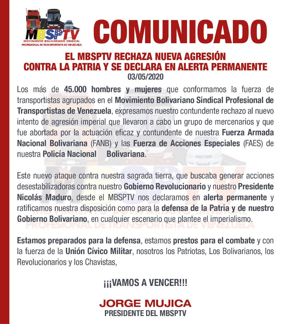 Este domingo del Movimiento Bolivariano Sindical Profesional de Transportistas de Venezuela, expresó su rechazo a la nueva agresión imperial que llevaron a cabo un grupo de mercenarios financiados por el Gobierno de los Estados Unidos y apoyados por la administración colombiana de Iván Duque.