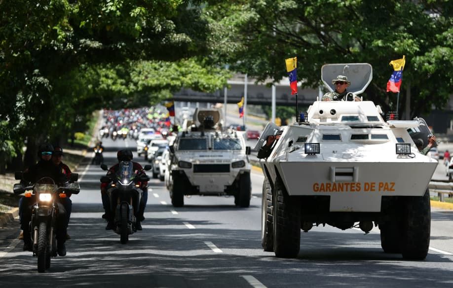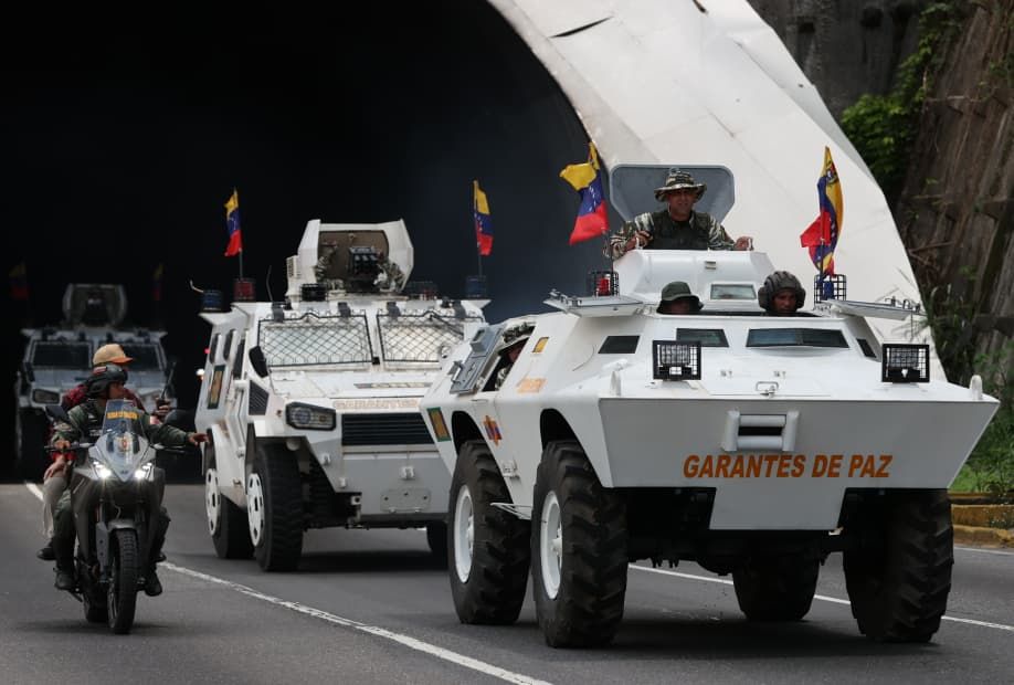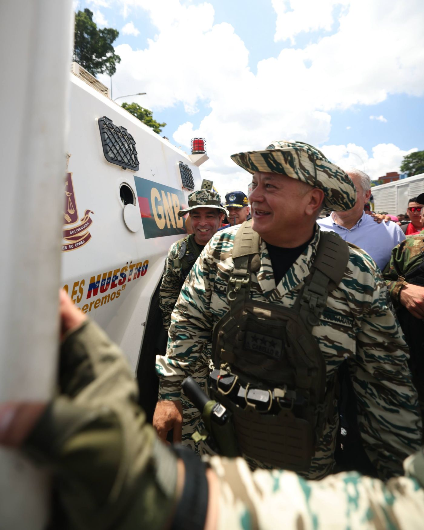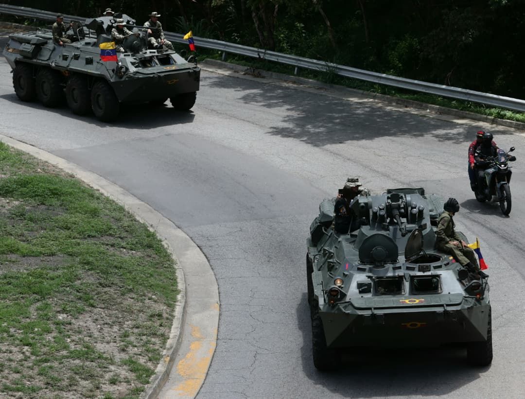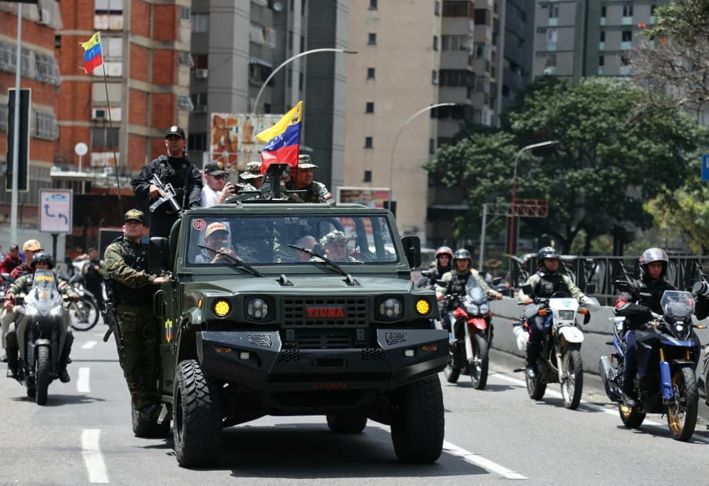 A bordo de un vehículo Tiuna de la Fuerza Armada Nacional Bolivariana (FANB), el vicepresidente sectorial de Política, Seguridad Ciudadana y Paz, Diosdado Cabello Rondón, lideró la caravana de unidades militares que se trasladó desde la ciudad de Guarenas en el municipio Plaza, hasta Petare, en el municipio Sucre.