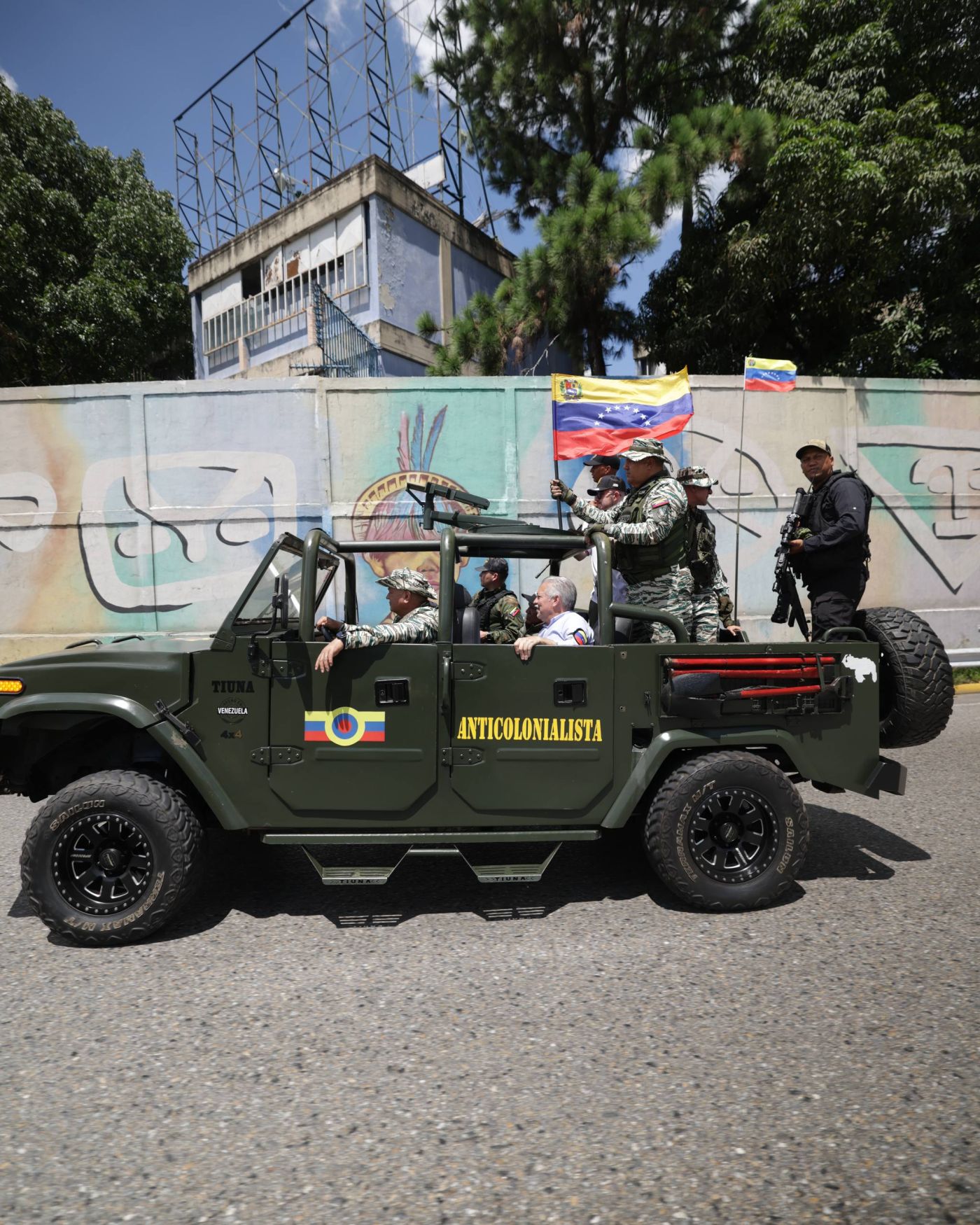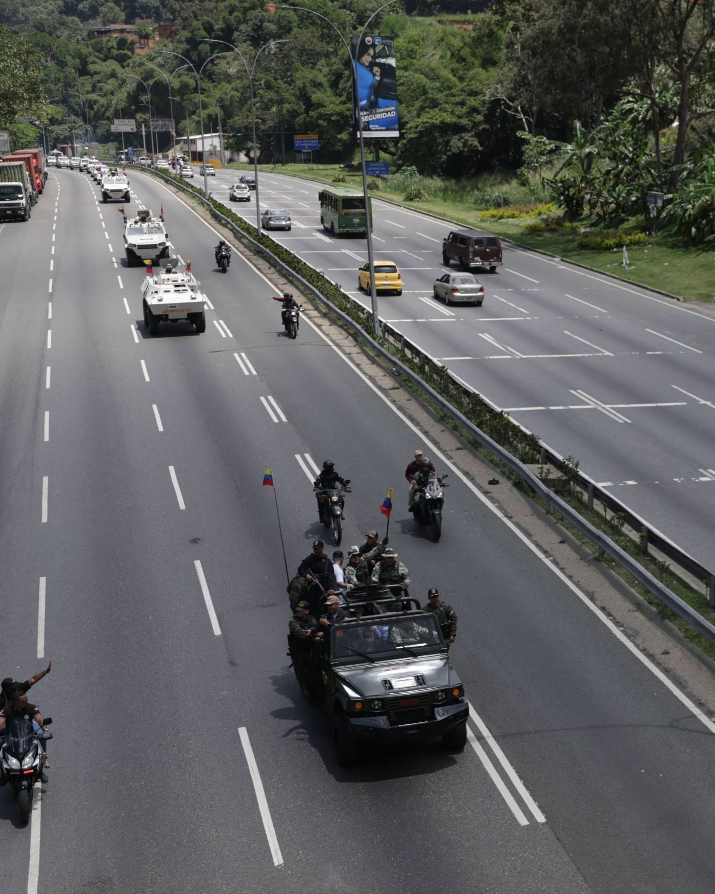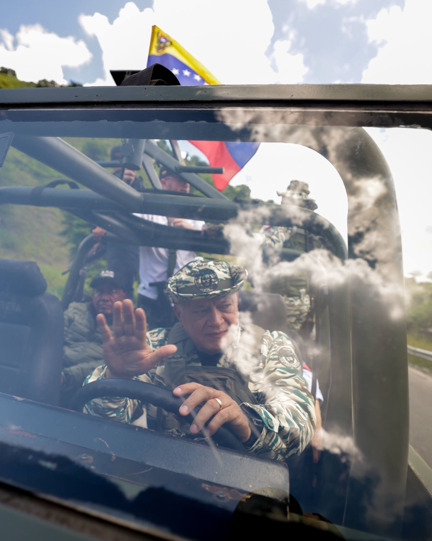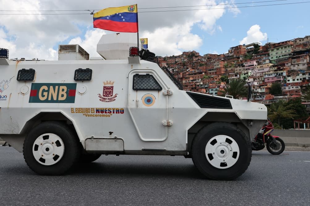 A bordo de un vehículo Tiuna de la Fuerza Armada Nacional Bolivariana (FANB), el vicepresidente sectorial de Política, Seguridad Ciudadana y Paz, Diosdado Cabello Rondón, lideró la caravana de unidades militares que se trasladó desde la ciudad de Guarenas en el municipio Plaza, hasta Petare, en el municipio Sucre.
