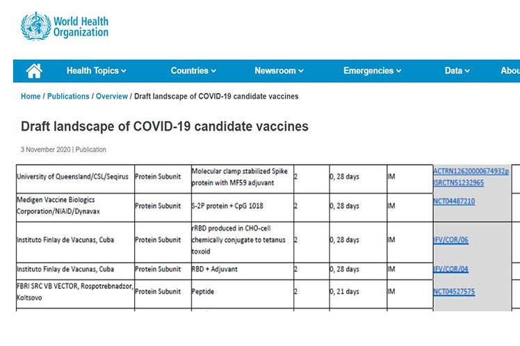La Organización Mundial de la Salud (OMS) incluyó hoy al segundo candidato de vacuna Soberana 02 de Cuba en el sitio oficial de proyectos en fases de ensayos clínicos contra la Covid-19.