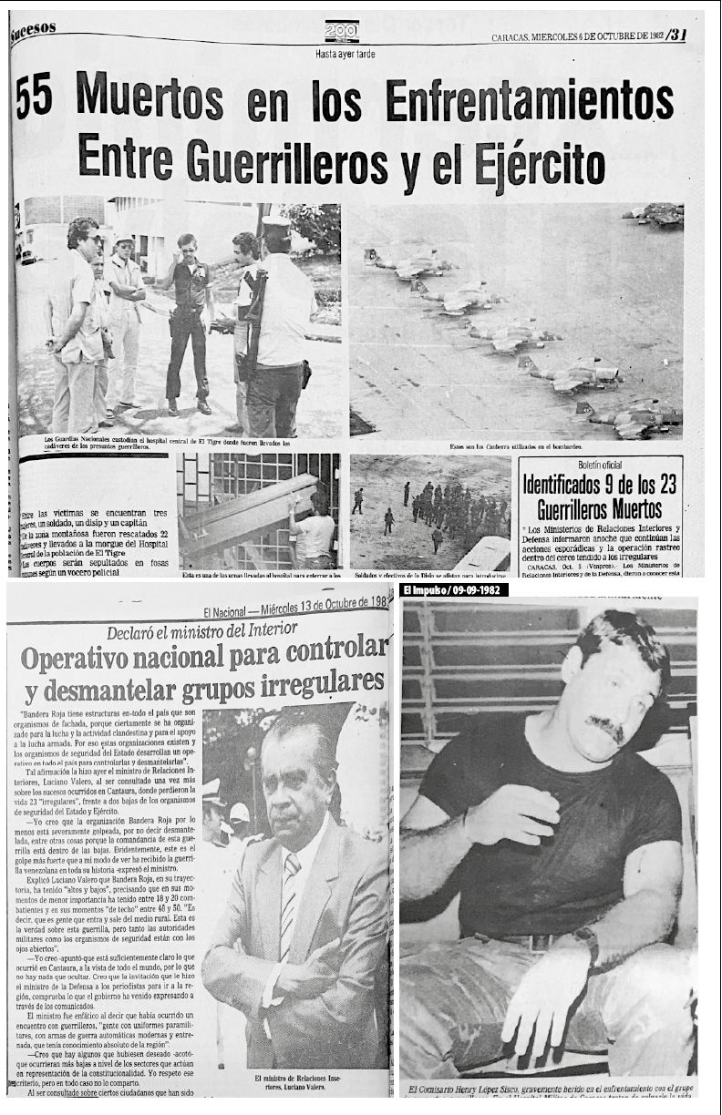- “DOS GUERRILEROS DELATARON EL CAMPAMENTO”. El Nacional, 8 de octubre de 1982: “Por una delación de dos guerrilleros se logró descubrir el campamento de Bandera Roja cerca de Cantaura. Dos delatores sobrevolaron la zona en un helicóptero privado, donde iban tres agentes de seguridad del Estado”.
