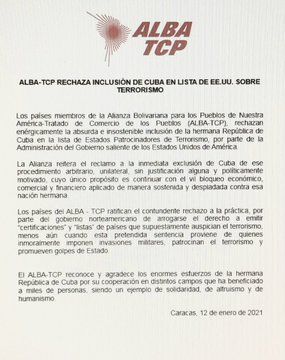 Este martes 12 de enero los países miembros de la Alianza Bolivariana para los Pueblos de Nuestra América-Tratado de Comercio de los Pueblos (ALBA-TCP) expresaron su rechazo a la acusación realizada por Mike Pompeo que describe a Cuba como "Estado patrocinador del terrorismo".