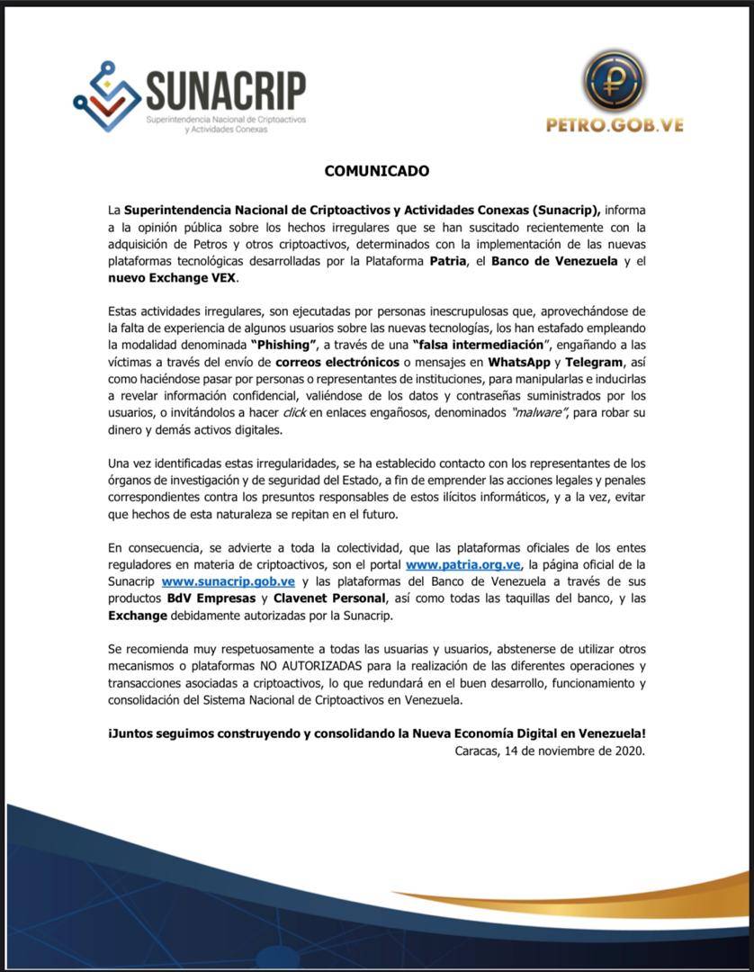 "En consecuencia, se advierte a toda la colectividad, que las plataformas oficiales de los entes reguladores en materia de criptoactivos, son el portal www.patria.org.ve, la página oficial de la Sunacrip www.sunacrip.gob.ve y las plataformas del Banco de Venezuela a través de sus productos BdV Empresas y Clavenet Personal, así como todas las taquillas del banco, y las Exchange debidamente autorizadas por la Sunacrip", precisó el Comunicado.