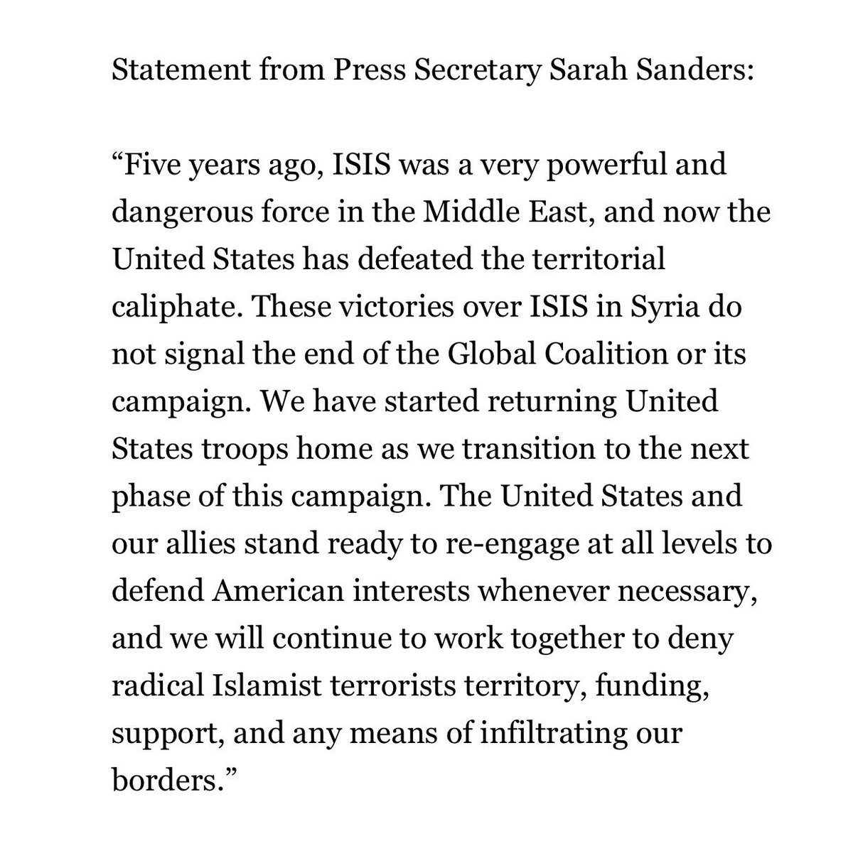 El despiadado imperio a través de Sander indicó que "estas victorias sobre Siria no señalan el final de la Coalición Global o su campaña. Hemos comenzado a enviar de vuelta a casa a las tropas estadounidenses al tiempo que pasamos a la siguiente fase de esta campaña".