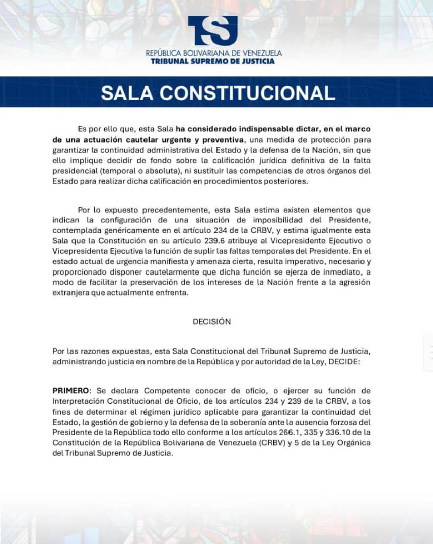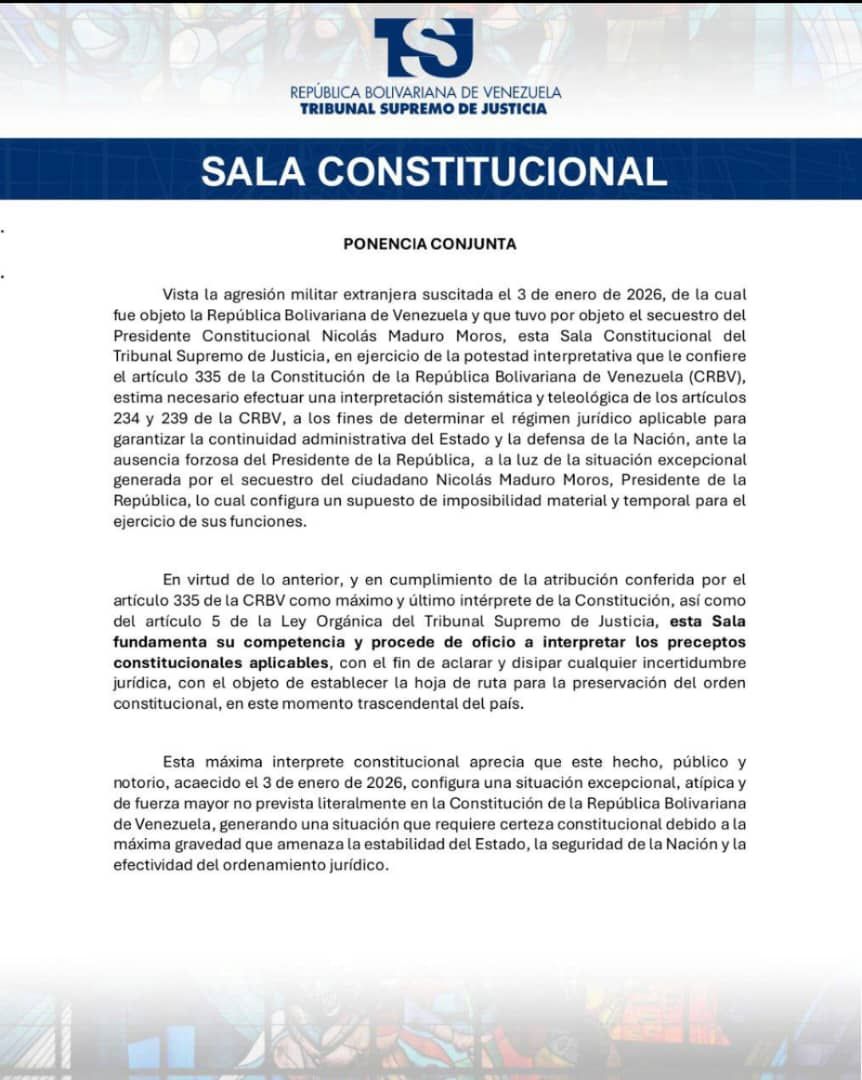 A través de un comunicado, leído por la magistrada Tania D’amelio, el máximo tribunal del país explicó que, en vista de la agresión militar extranjera suscitada el 3 de enero de 2026, de la cual fue objeto la República Bolivariana de Venezuela y que tuvo por objeto el secuestro del presidente constitucional, Nicolás Maduro Moros, esta Sala Constitucional, en ejercicio de la potestad interpretativa que confiere el artículo 335 de la Constitución, estima necesario efectuar una interpretación sistemática y teleológica de los artículos 234 y 239 de la Carta Magna.