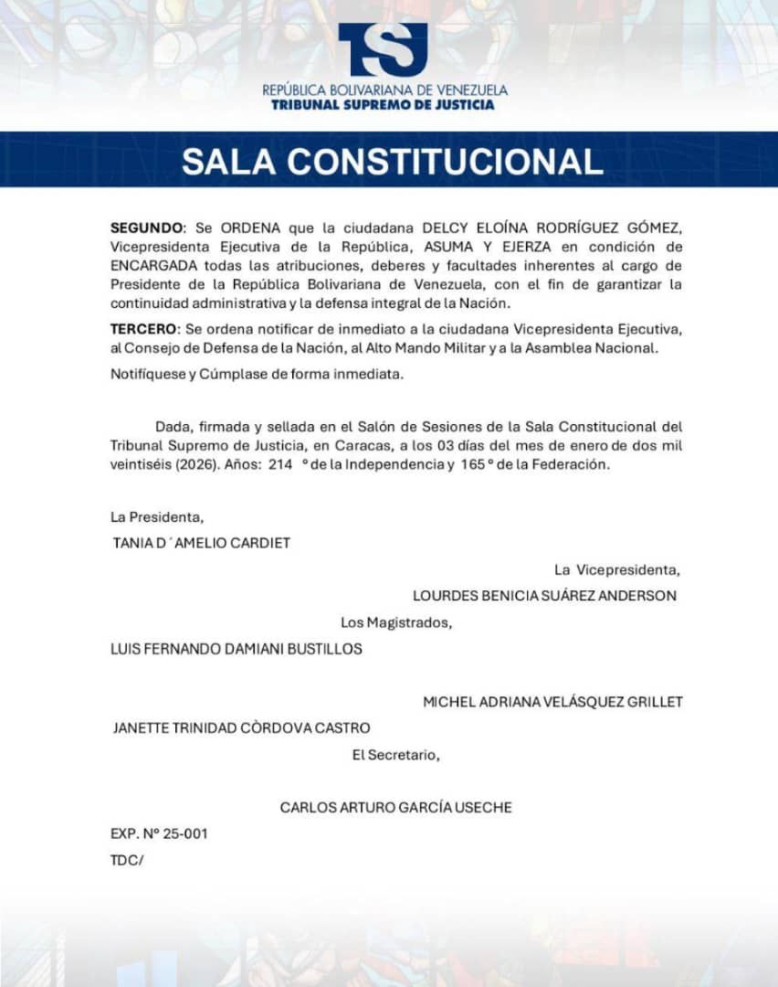 La Sala Constitucional del Tribunal Supremo de Justicia (TSJ) ordenó este sábado la juramentación de la vicepresidenta Ejecutiva, Delcy Rodríguez, como presidenta encargada de la República Bolivariana de Venezuela, ante el secuestro del jefe de Estado Nicolás Maduro por parte de Estados Unidos (EEUU).