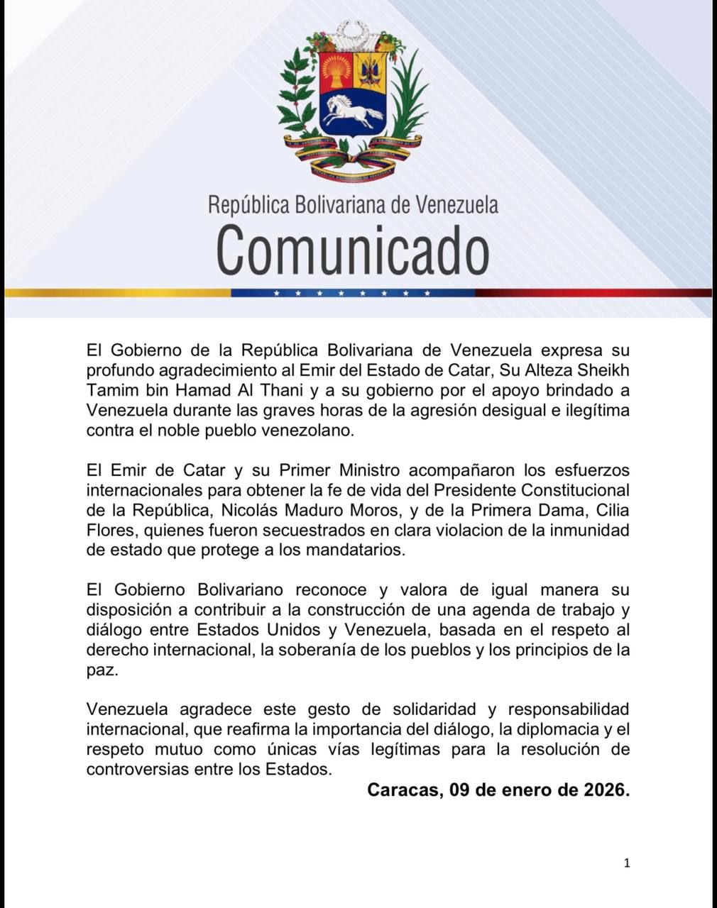 El gobierno de Venezuela agradeció la solidaridad del Emir del Estado de Catar, Su Alteza Sheikh Tamim bin Hamad Al Thani y a su gobierno por el apoyo brindado a Venezuela antes y durante los bombardeos de los Estados Unidos contra diversas entidades del país suramericano que dejó más de una centena de muertos y otros más heridos,