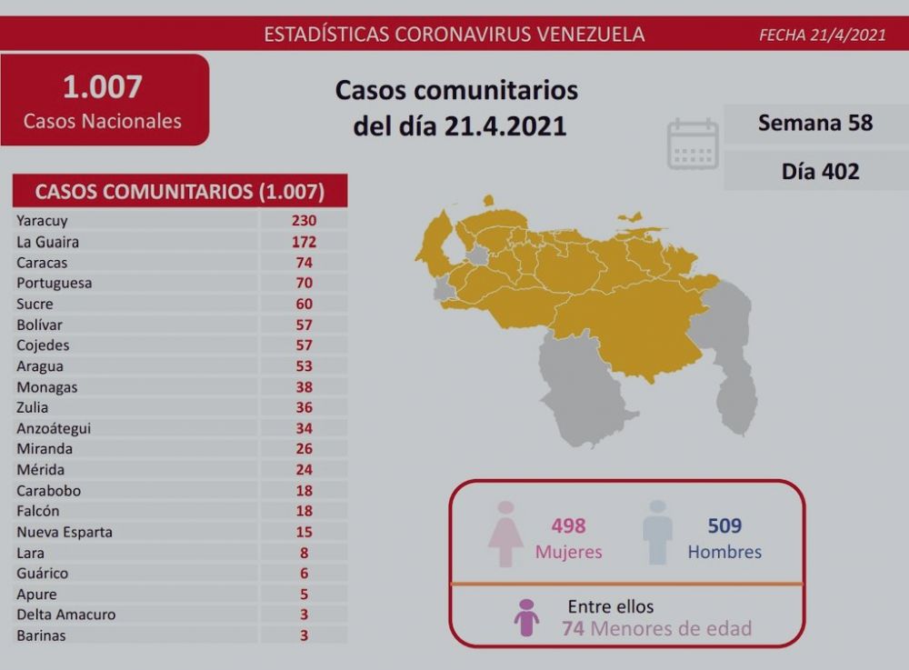 Sobre los fallecidos, lamentó informar el deceso de 21 venezolanos tratándose de 2 mujeres de 65, 67 años y 3 hombres de 51, 61, 69 años de Caracas; 2 hombres de 50, 67 años y 2 mujeres, ambas de 64 años de Bolívar;  2 hombres de 41, 50 años y 1 mujer de 59 de Zulia; 2 hombres de 71, 80 años de Yaracuy; 2 hombres de 80, 84 años de Miranda; 1 hombre de 38 años de Trujillo; 1 hombre de 77 años de Anzoátegui; 1 hombre de 58 años de Cojedes; 1 hombre de 55 años de Carabobo y 1 hombre de 50 años de Lara.