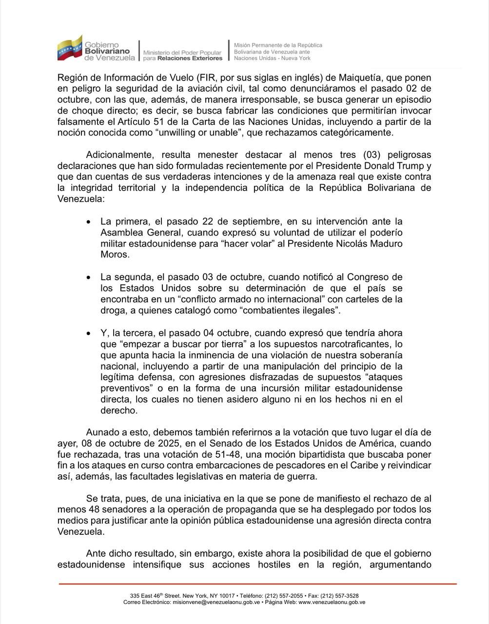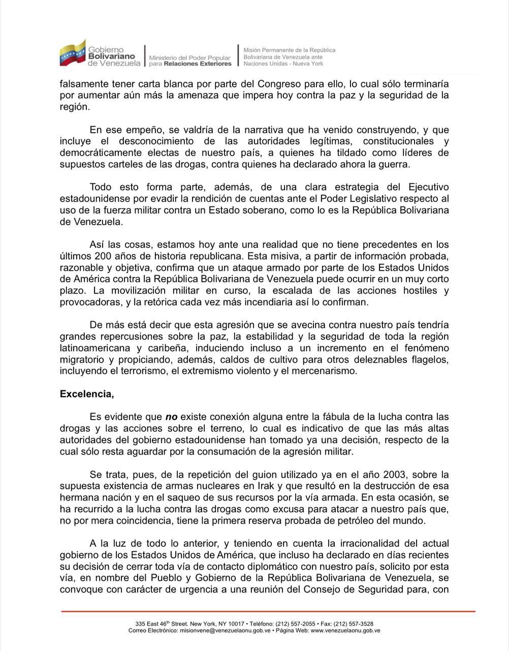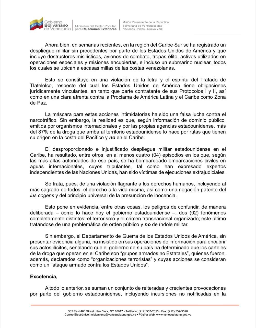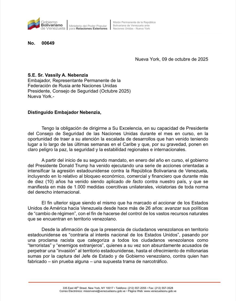 El Gobierno Bolivariano de Venezuela ha solicitado formalmente una reunión de urgencia del Consejo de Seguridad de las Naciones Unidas, ante la grave escalada de agresiones y despliegue militar sin precedentes de los Estados Unidos en el Caribe.